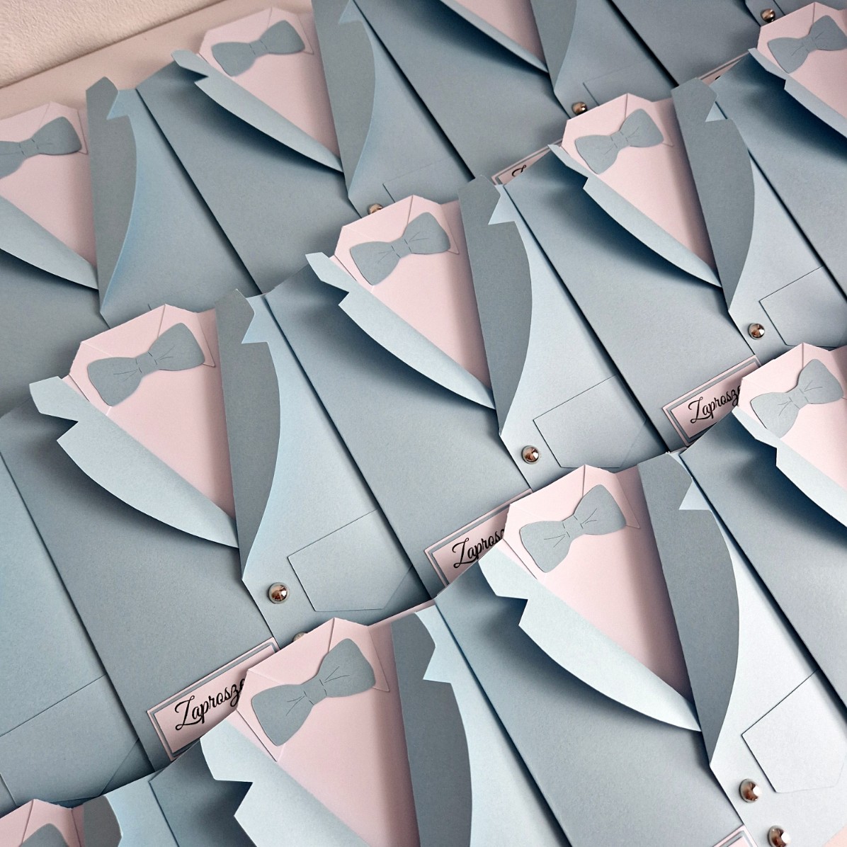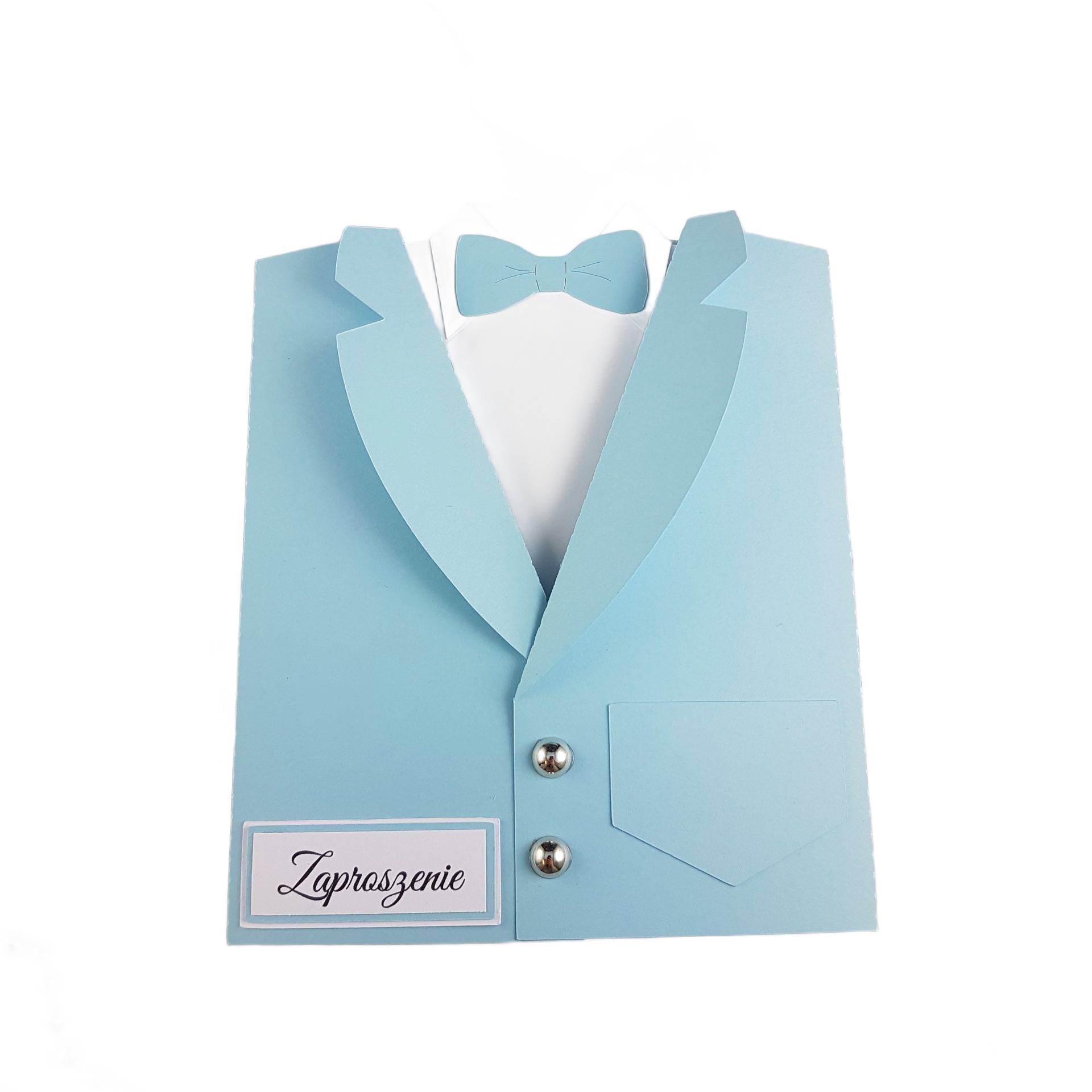 Zaproszenie na Pierwszą Komunię w kształcie garnituru.
