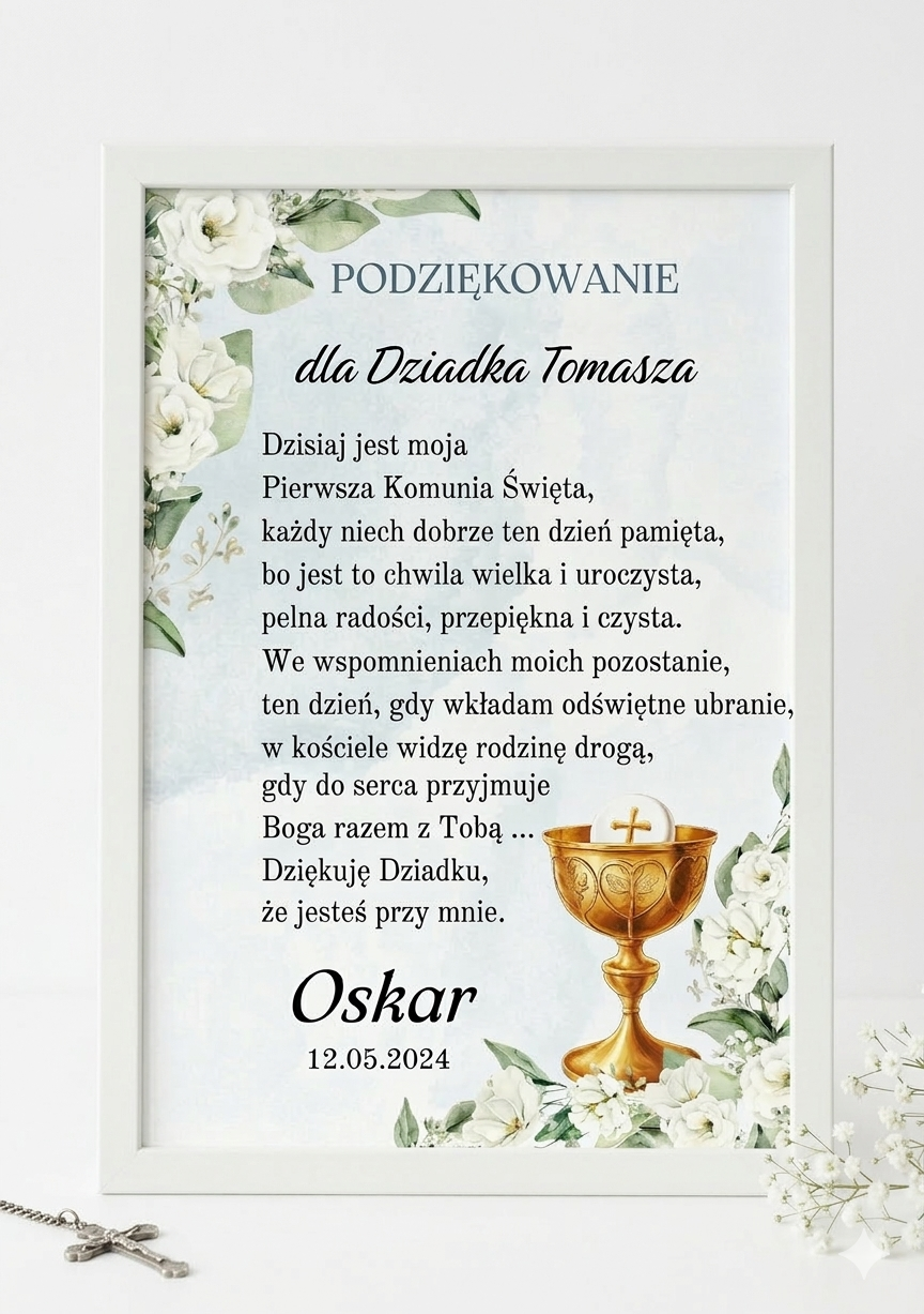 Podziękowania dla Chrzestnych, Dziadków ramka, dyplom A4 Komunia