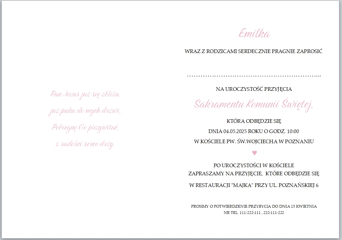 Zaproszenie na Pierwszą Komunię Świętą.