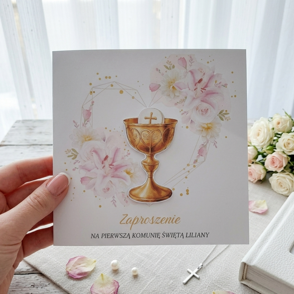 ręcznie wykończonym zaproszeniem na Pierwszą Komunię Świętą.